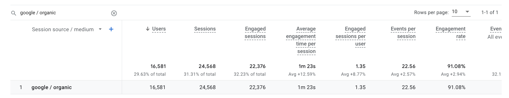 This metric shows the ratio of engaged sessions to total sessions. An engaged session is a session that: lasts longer than 10 seconds, has a conversion event or has at least two pageviews or screen views.
