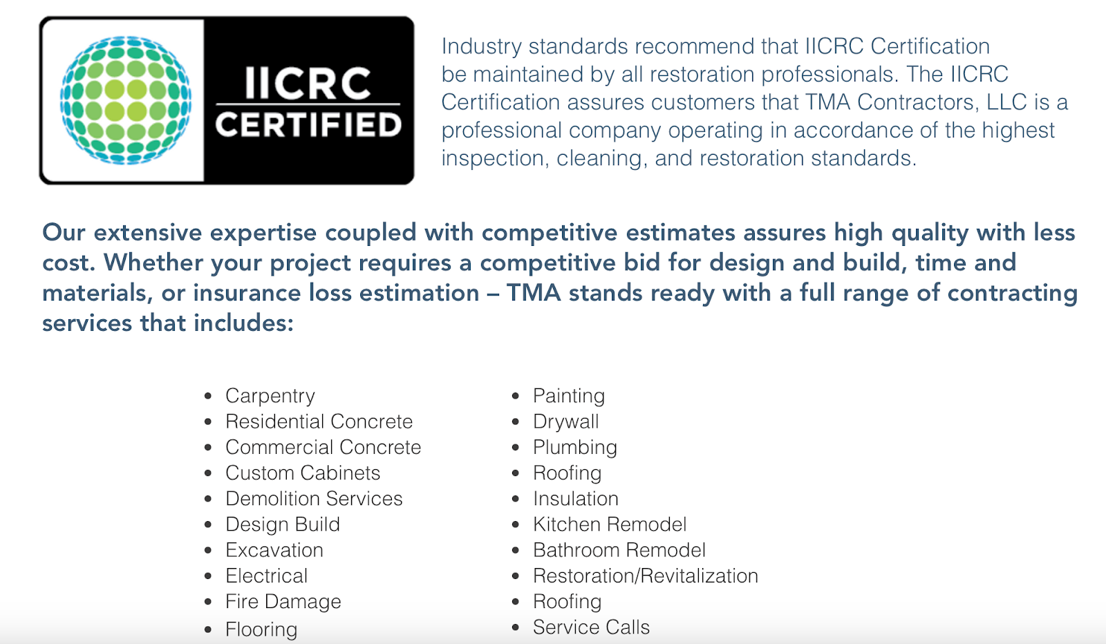 Storytelling. The web developers built a website designed to seamlessly answer the questions of potential clients as they arise in their research and consideration. The flow of the homepage tells a story that TMA Contractors Group is exactly what the prospect is looking for.