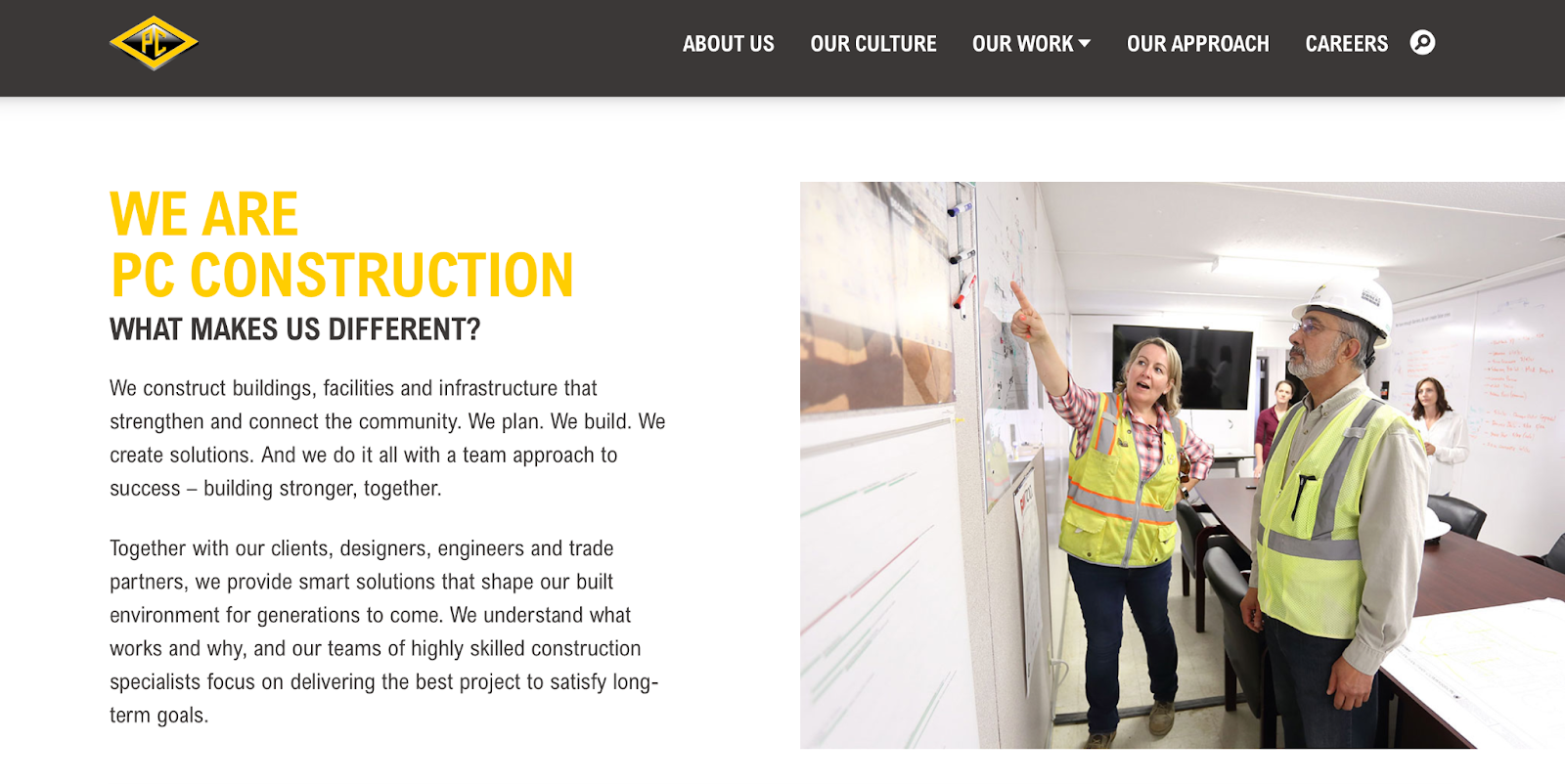 Leading with purpose. Instead of displaying their services, PC Construction chose to lead with a paragraph about their purpose-driven business model. This design choice further supports their people-first approach to business.