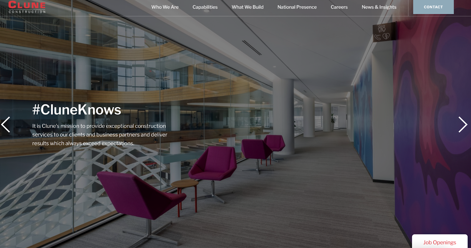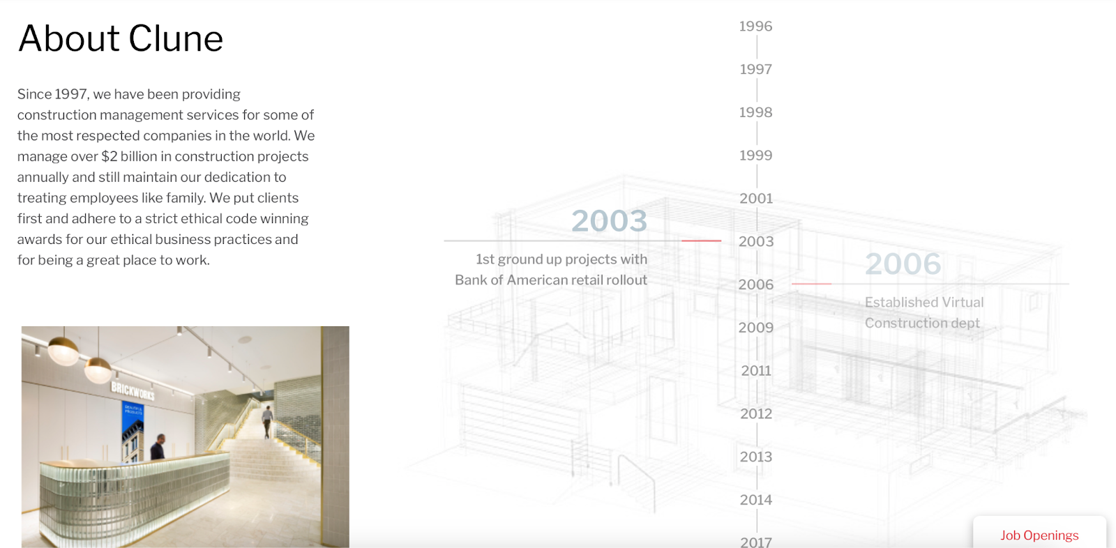 Impress and invite. Clune Construction’s website strikes the perfect balance between impressing viewers and inviting them to take action. By including a unique timeline of the company’s history, online users instantly feel like they are part of something bigger when they work with Clune Construction.