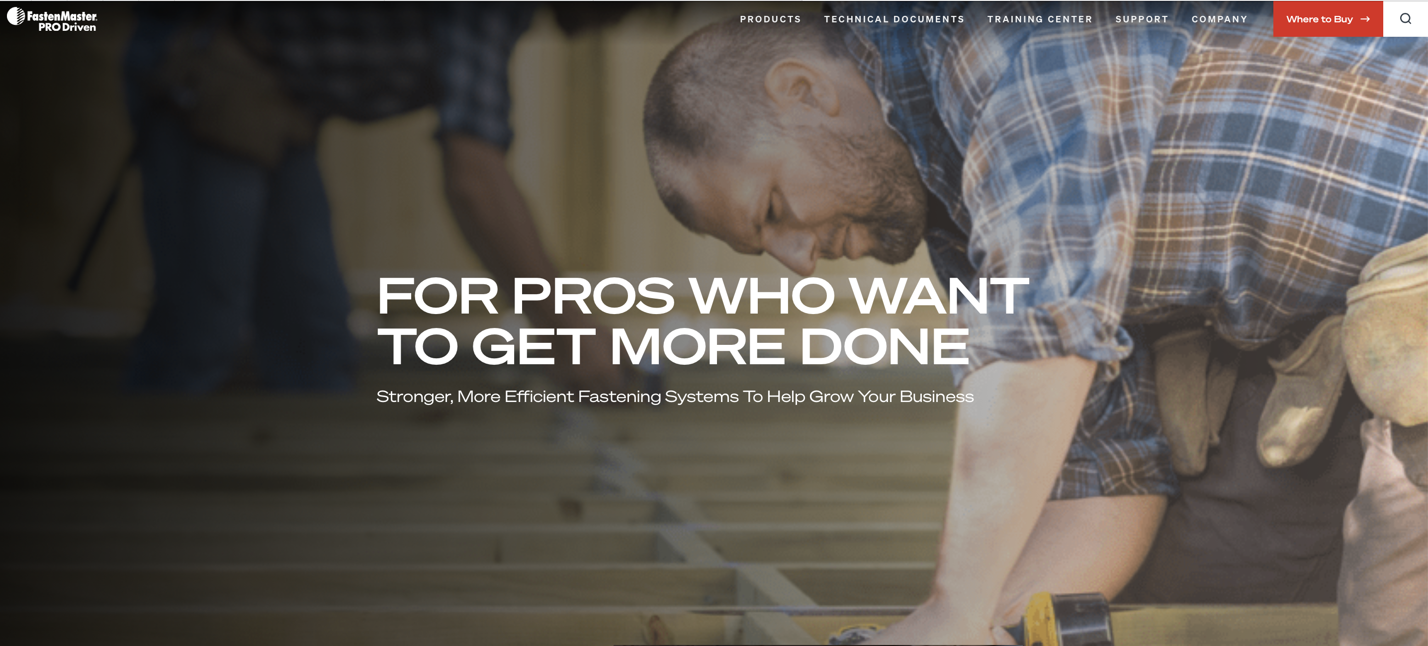 Their website features a modern, easy-to-read font with clean, sharp lines. Their messaging is also excessively clear — it tells you who it's for (pros), what they’ll get out of using FastenMaster products (more done) and how that will happen (through fast, efficient systems).