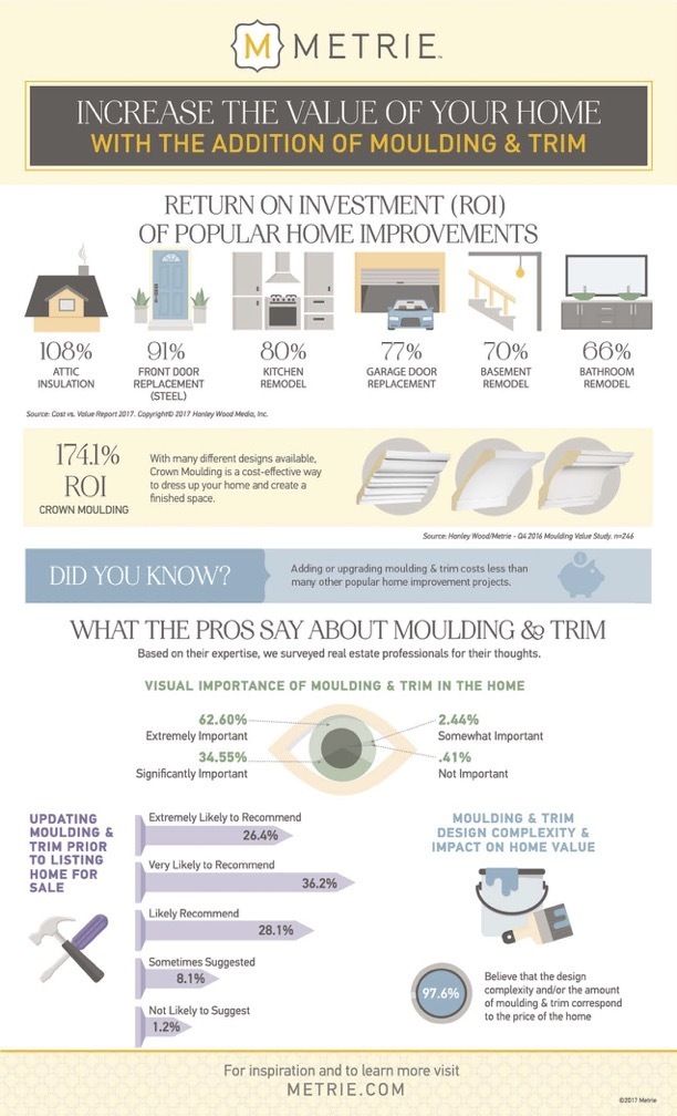 This infographic from Metrie, for instance, doesn’t focus on the company’s moulding and trim products. Instead, it shows potential customers how much property value increases when different types of trim are used.