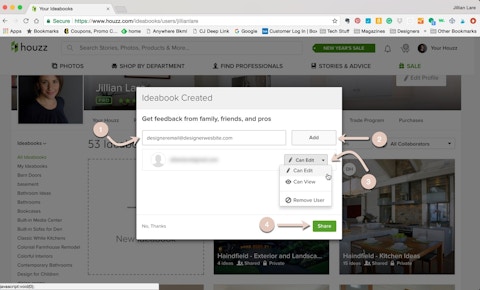 Then, you will type in the email address of the person you want to invite to the page, and give them either view-only access or edit access if you want them to be able to comment or add to your Ideabook. Once you are ready, hit “Share” to send to your Ideabook.
