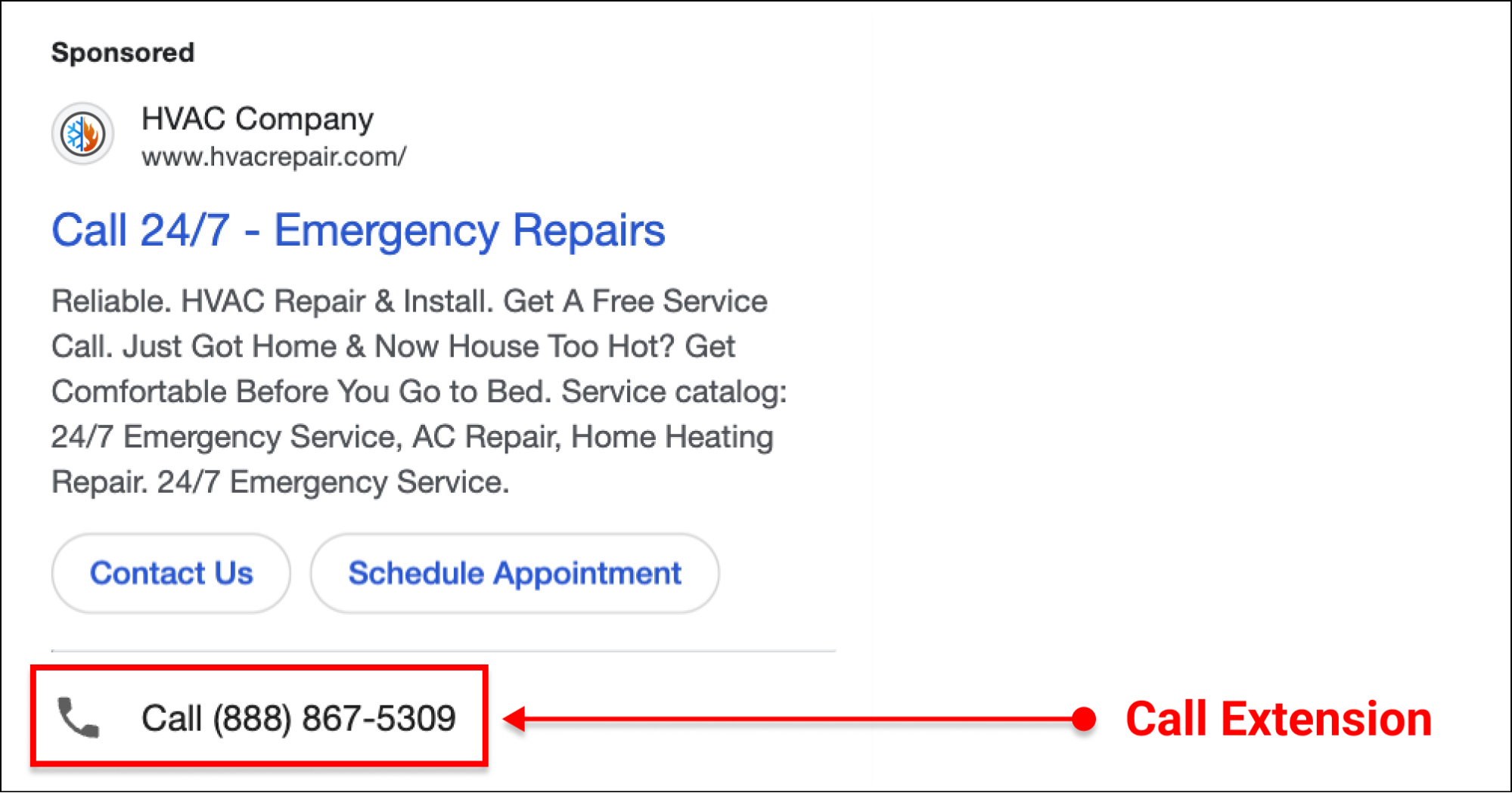 These pull in your business address from your Google Business Profile and display it under your ad. For HVAC businesses, this builds local trust fast.