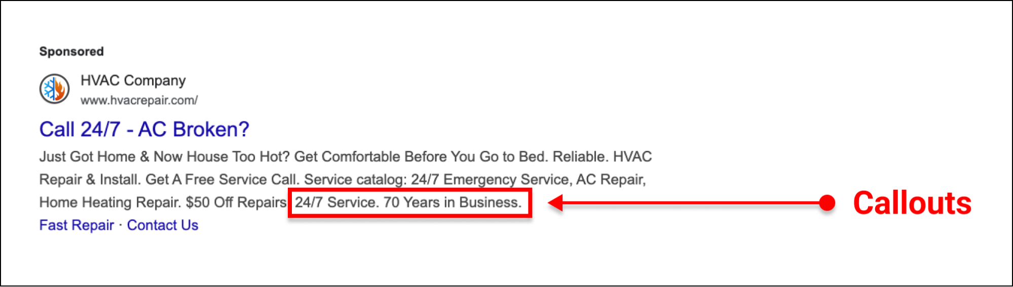 Callouts are short snippets of text (25 characters max) that appear below your description. They’re not clickable but give extra context to help close the deal.