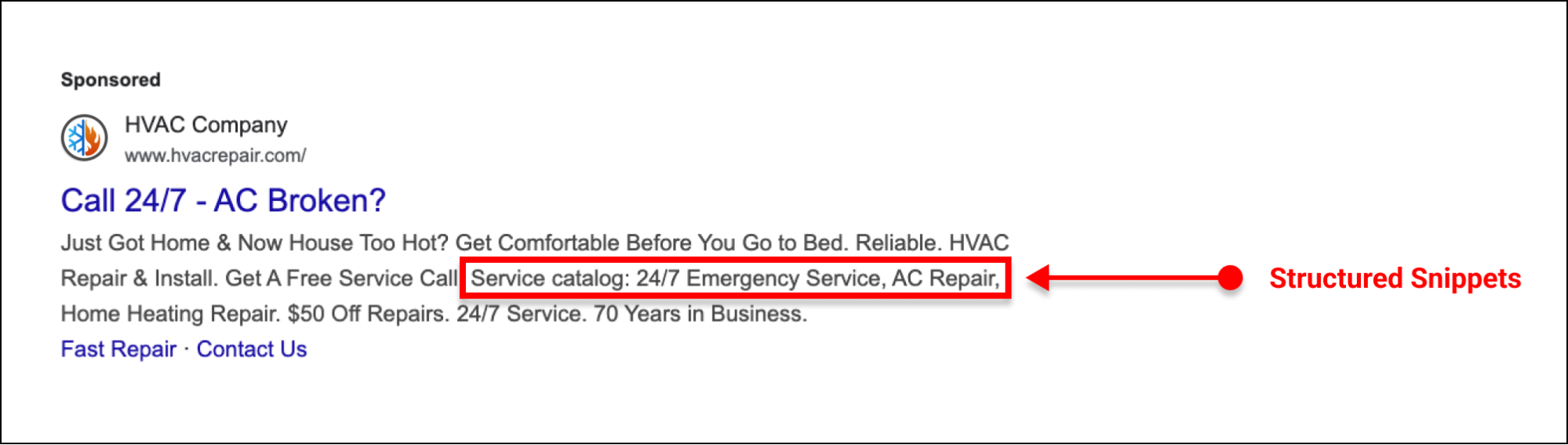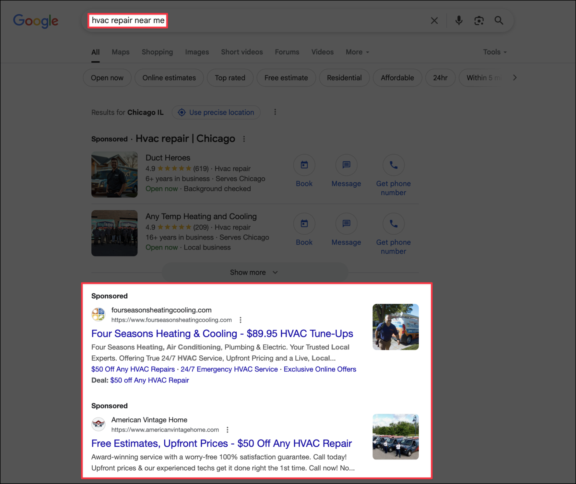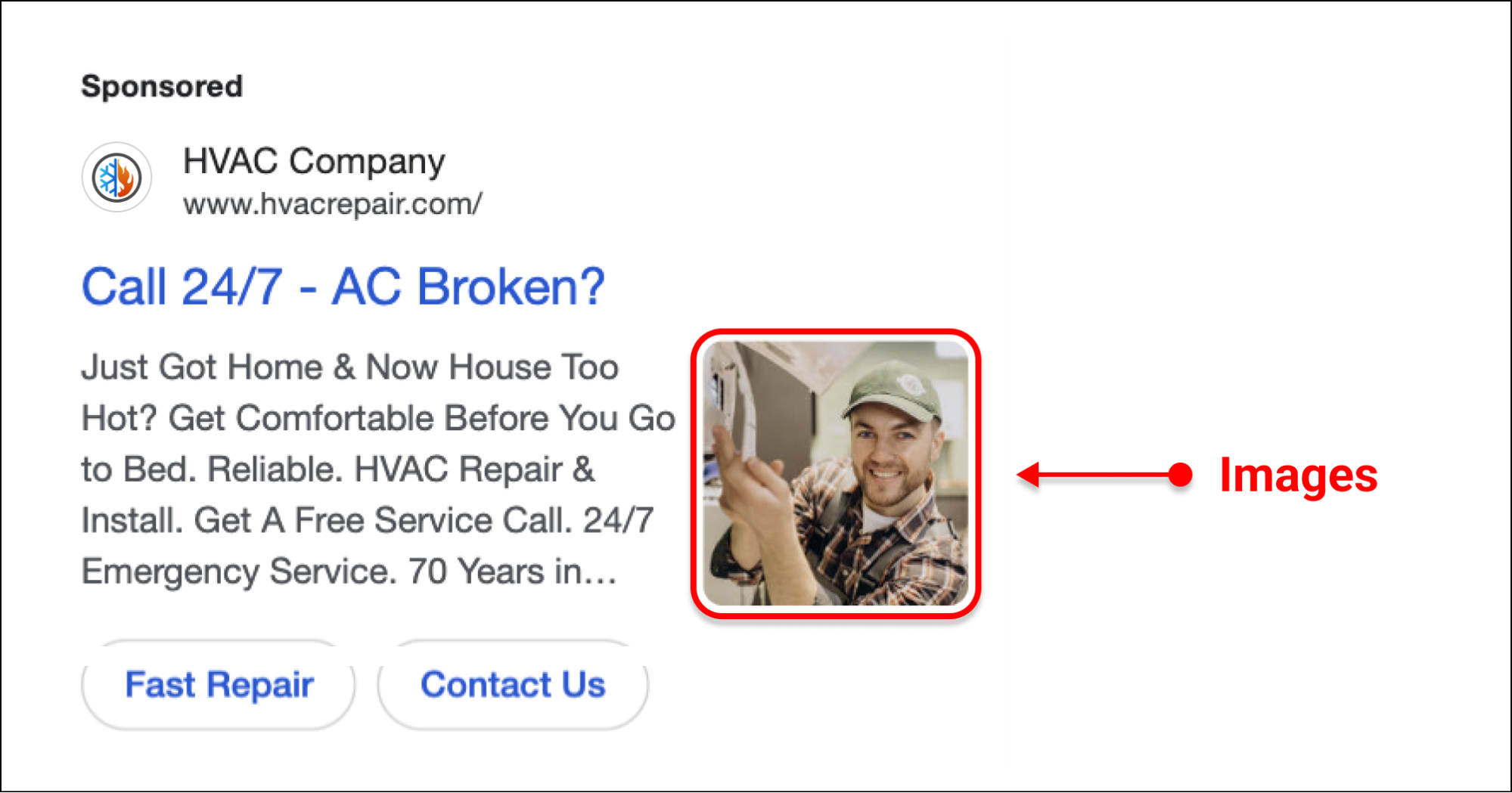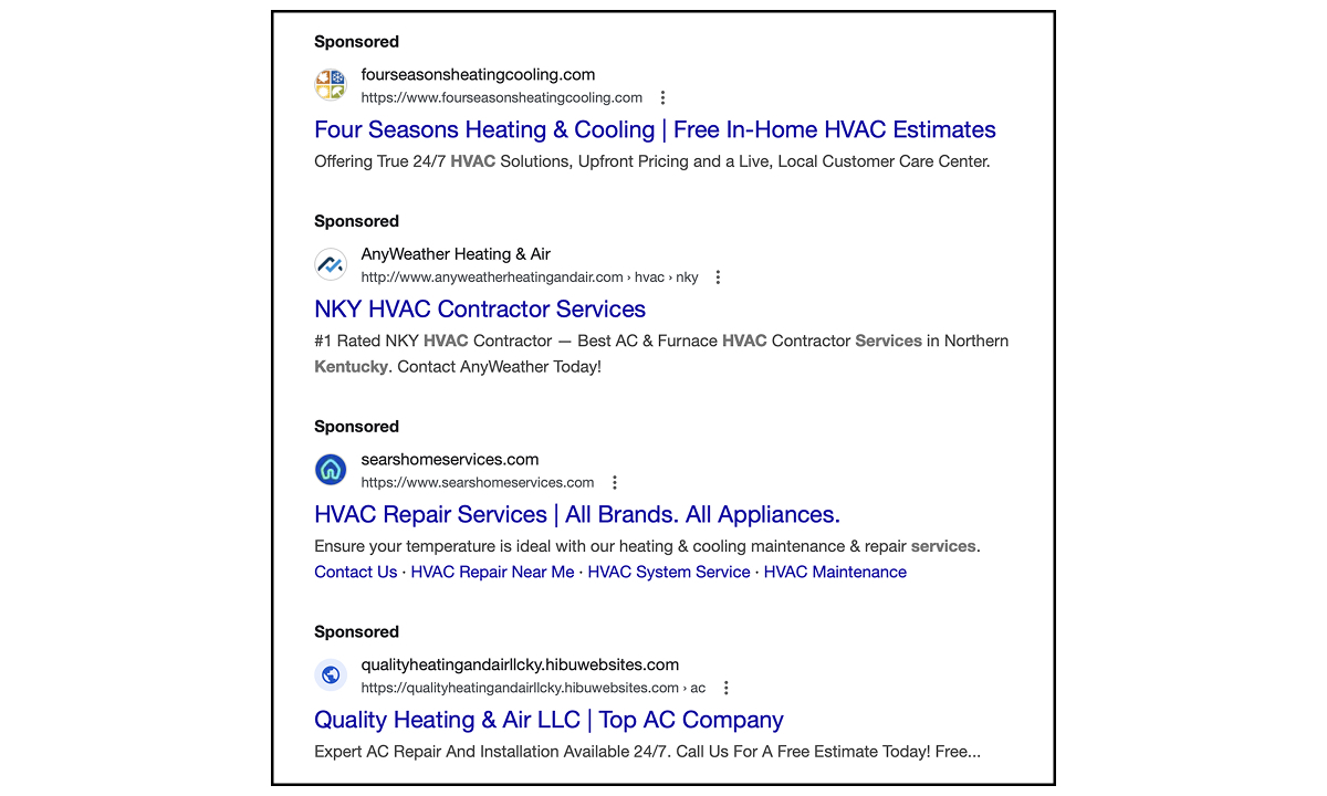 With Google Ads, you're limited in space, but that limitation is something you can take advantage of. When someone searches for something like ac repair near me, your ad won't be the only one showing. Google stacks multiple results, and the ones that take up more visual space tend to stand out a bit more.