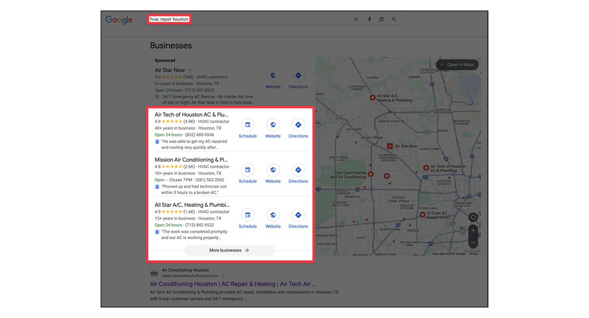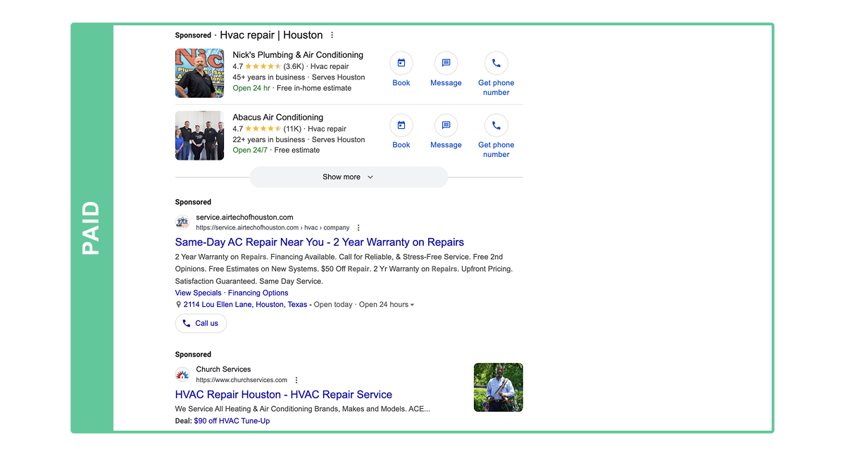 The first section is where paid ads appear. If you want to show up here, you have to pay Google by running Local Services Ads or Google Search Ads for HVAC.