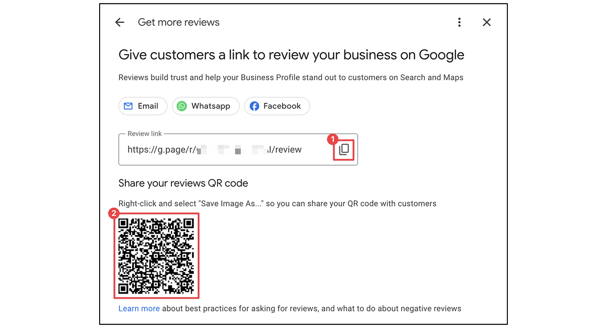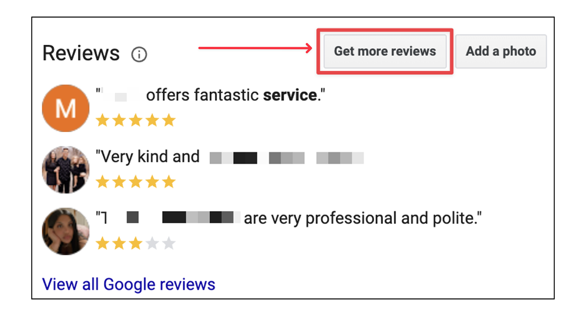 Google gives you a couple simple ways to make it easier to send customers to your listing to leave a review. Find your listing on Google, scroll down, and click where it says “Get more reviews.”