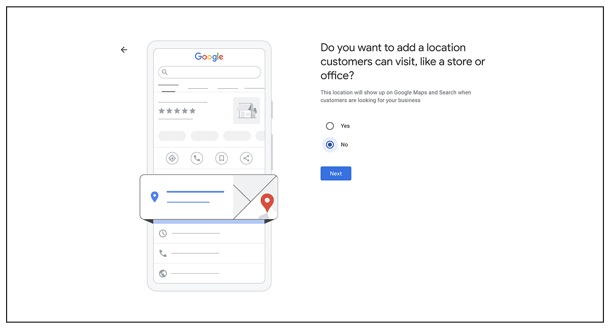 Google will ask if you want to add a location customers can visit. This location will show up on Google Maps and Search when people search for the types of services you provide.