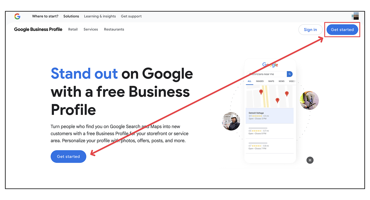 Go to google.com/business and click the “Get started” button.