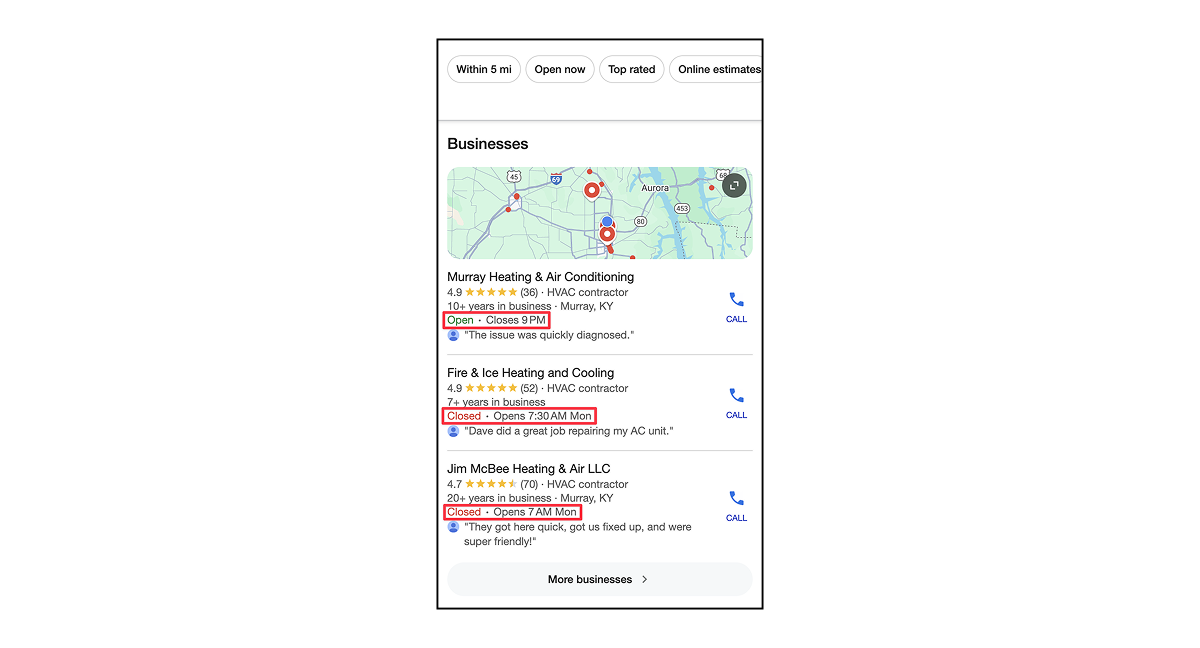 But if any of your competitors have their hours listed as 24/7, they are more likely to rank higher than you during that time and get the call instead. For example, notice how the listing below is ranked higher than the other two? That’s because they were still open when I did this search.
