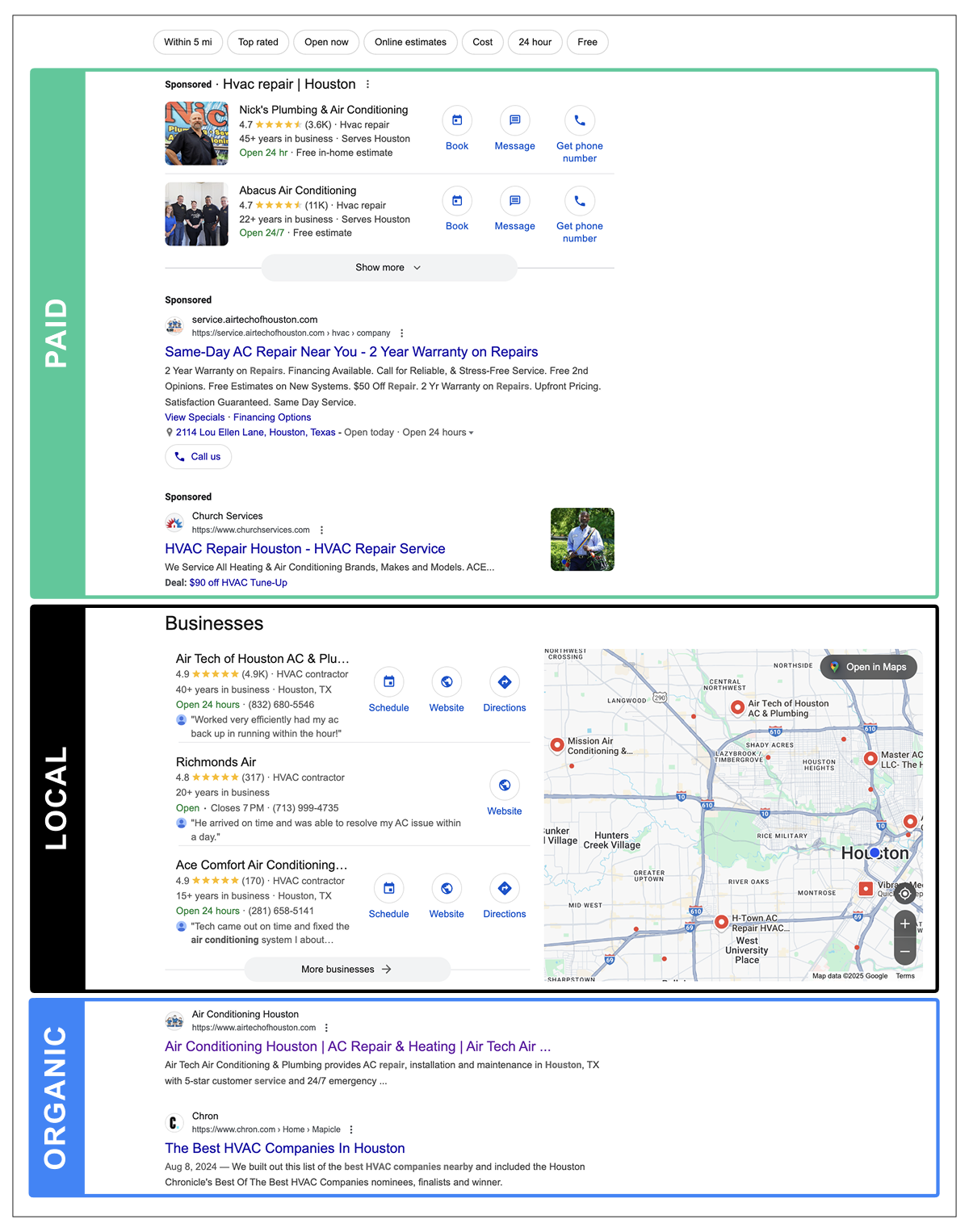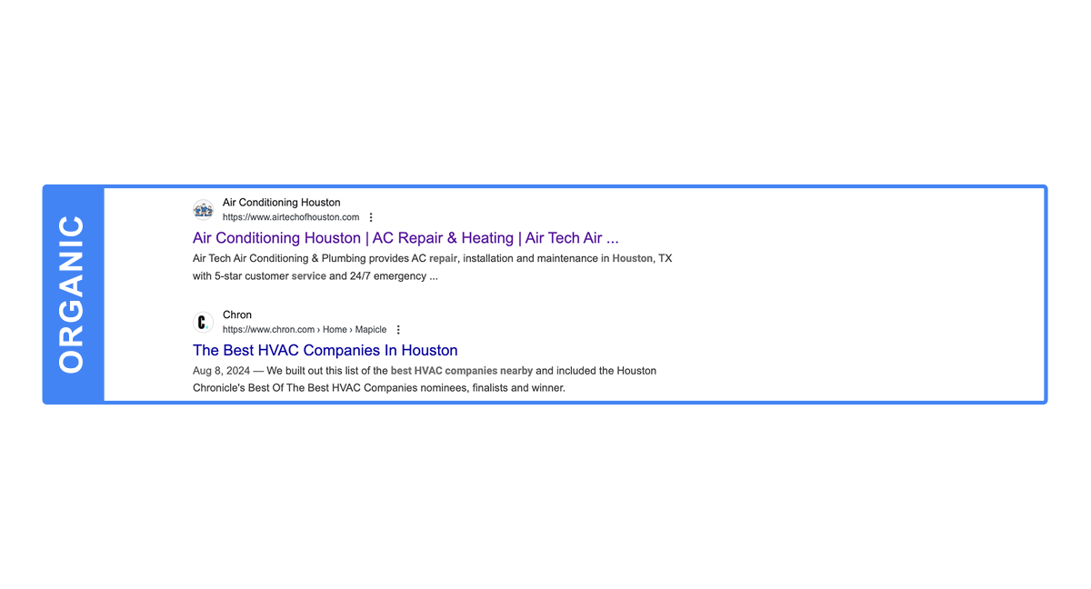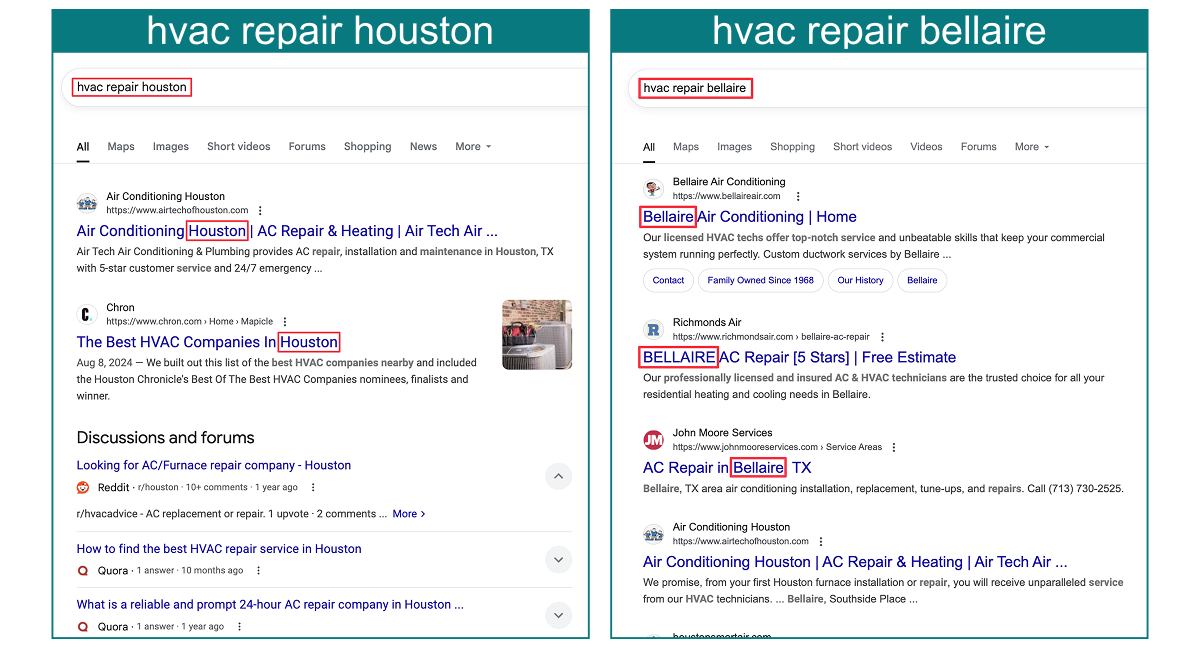 If you search for hvac repair houston and hvac repair bellaire, you’ll see that Google returns organic results more specific to Bellaire, TX.