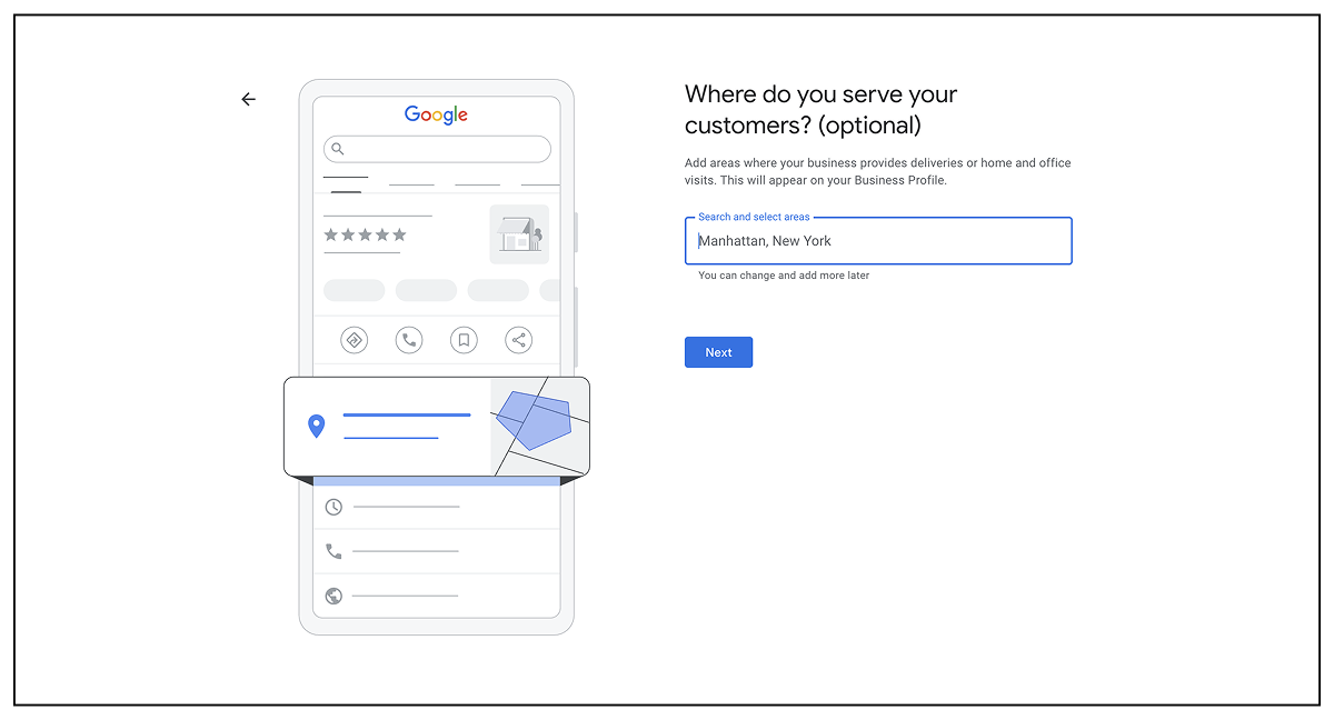 Next, enter the area you serve. To keep things simple, just enter the main city or town you operate in. You’ll be able to add more locations later.