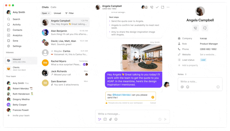 My recommendation is to sign up for OpenPhone. Pricing starts at $15 per month. It’s easy to set up, train new people how to use, and you’ll actually talk to a real person whenever you contact their support. OpenPhone gives you a way to call and text your customers from one app and has a bunch of automation features built in.