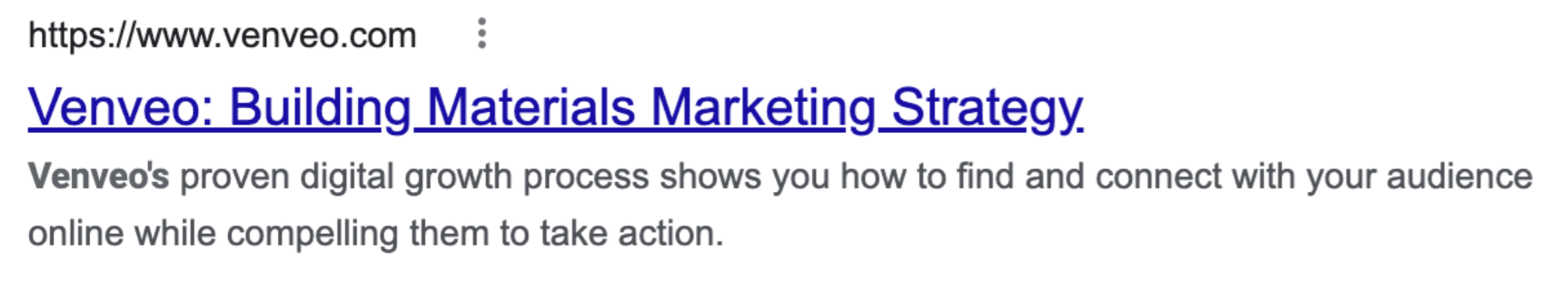 The page title is underlined and in blue, and the meta description is in gray underneath. When manufacturers search for “manufacturing marketing,” they first see that keyword in the page title, which draws their eye in. Then, the meta description tells them what they’ll find on our website.
