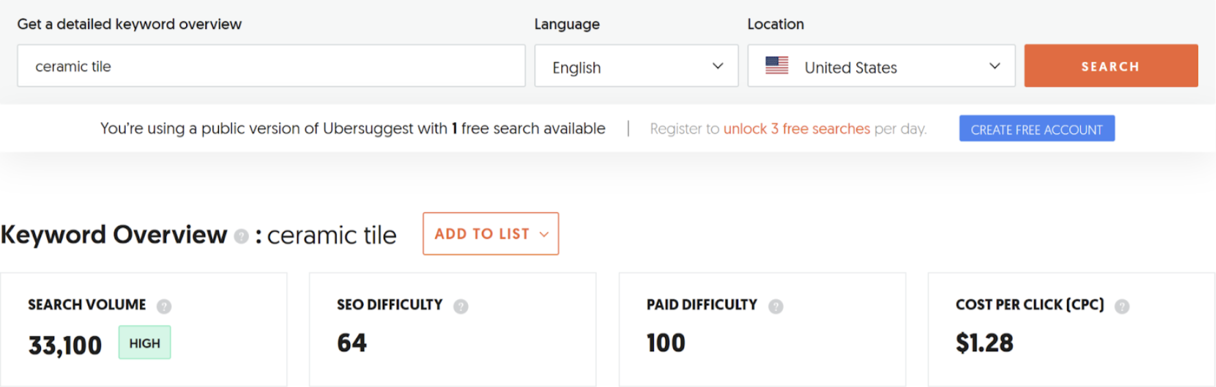 Ubersuggest is another free keyword research tool. Enter your search term, and it will not only give you an overview of the search statistics for that word, but it will also give you other keyword ideas related to it and content ideas for that specific term.