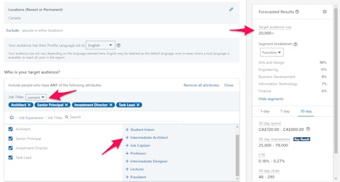 Visit LinkedIn’s ad platform and begin creating an audience based on company and position.
