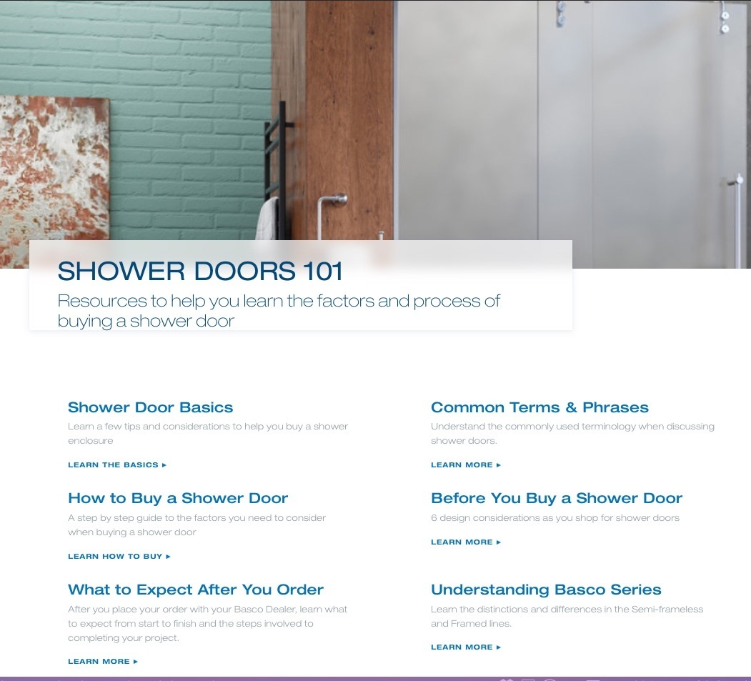 Basco Shower Door is a manufacturer doing this really well right now. They have a Shower Doors 101 article on their website that may feel consumer-focused but it also applies to builders and contractors. They include everything you could possibly think of, like what to know before you buy, how to measure and where to go to buy.