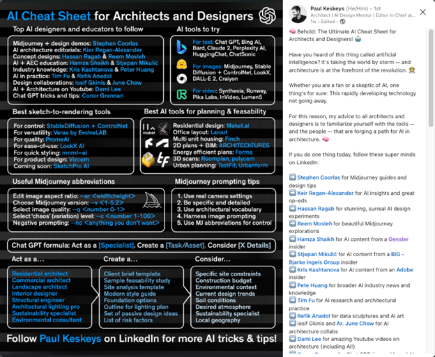 To provide a more practical framework for architects, Paul created an AI Architecture Cheat Sheet. This cheat sheet serves as a starting point for architects to familiarize themselves with the different tools and leaders in the AI space, such as Stephen, a practicing architect experimenting with AI-generated images from text prompts.