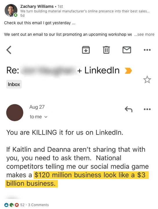 We recently got an email from one of our clients, who we’ve helped build their LinkedIn presence. Our client was at a networking event for the building materials space. His company does $100 million in revenue a year. He met someone else who does $3 billion in revenue, and the CEO knew exactly who he was from LinkedIn.
