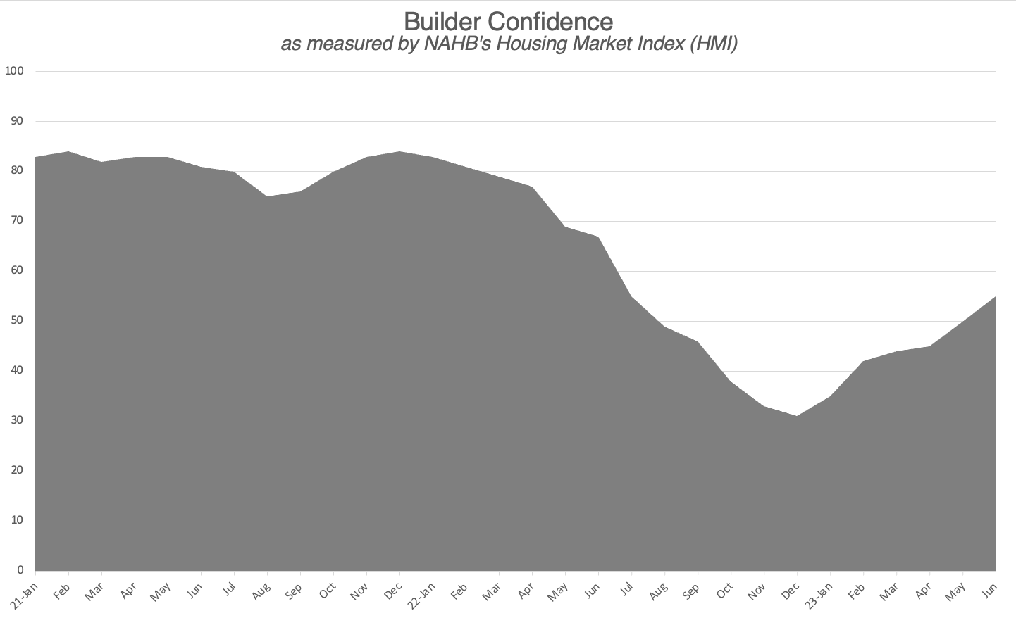 Grant posted an article on LinkedIn on the 2024-2025 outlook for new single-family residential construction that was surprising. The first graph in the article showed builder confidence tracked over the past 24 months. It was in decline until December of last year before it started improving.